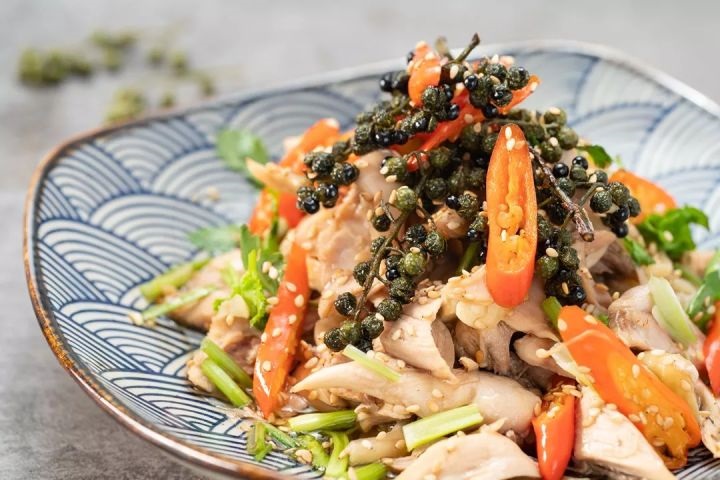 手撕辣椒雞是流傳於四川、重慶和新中國的一道傳統冷菜。這道菜的主角並不是一個辣椒,而是藤椒。藤椒又叫竹葉提取花椒,是一種藥食同源的香料。