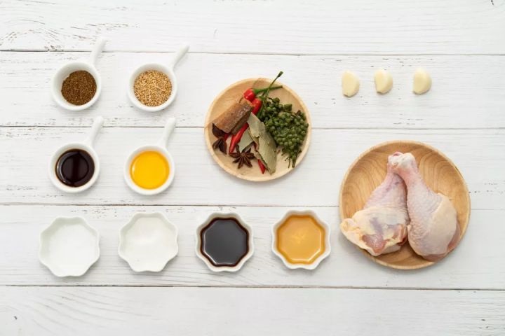 2. 醃制好的雞腿放入湯鍋中,加入沒過雞腿的水,放入薑片、香葉和桂皮,燒開後蓋上鍋蓋小火燜煮20分鍾,撈出放涼。